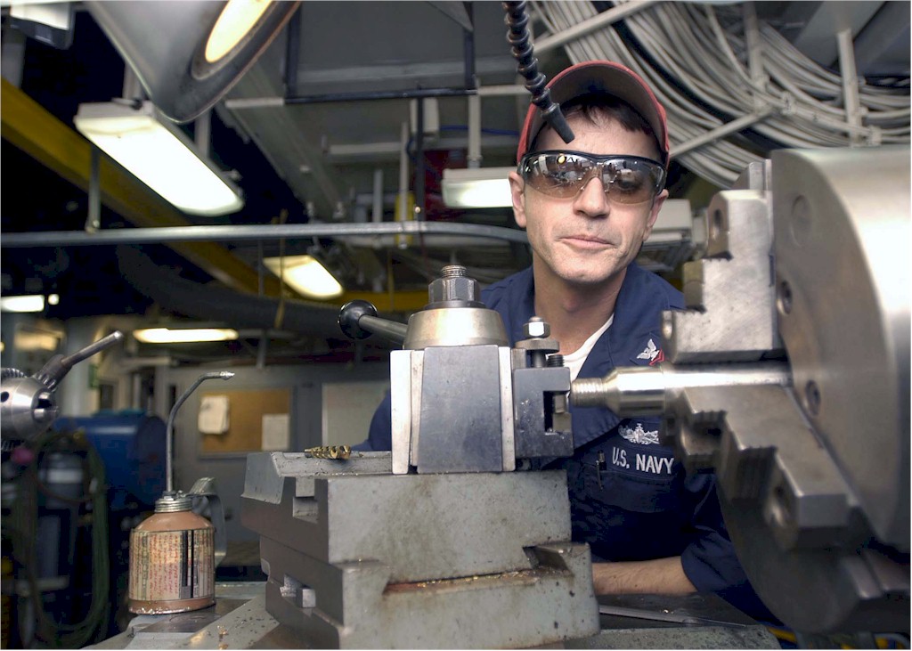 | 161k | 050104-N-9079D-181. Indian Ocean, January 4 2005, Machinery Repairman 1st Class Scott Sullivan cuts-out a screw on a lathe machine in the Repair Shop aboard the guided-missile destroyer USS Benfold (DDG 65). U.S. Navy photo by Photographer's Mate Airman Apprentice Ronald A. Dallatorre. | Robert M. Cieri |