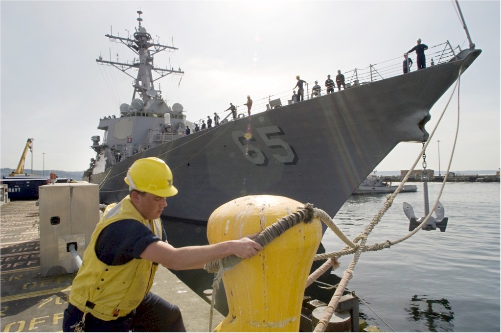 | 142k | 070515-N-3390M-003. May 15 2007, Boatswain’s Mate 2nd Class Randal Walters assigned to guided-missile destroyer USS Shoup (DDG 86) secures the forward mooring lines to a bollard as guided-missile destroyer USS Benfold (DDG 65) moors pier side at Naval Station Everett for a scheduled port visit. U.S. Navy photo by Mass Communication Specialist 2nd Class Douglas G. Morrison. | Robert M. Cieri |
