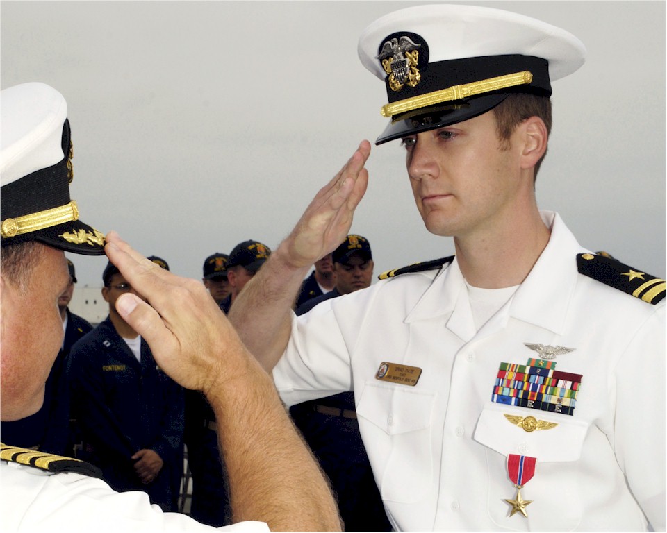 | 128k | 070824-N-7498L-043. U.S. Navy Lt. j.g. Bradley Pate, assigned to the guided-missile destroyer USS Benfold (DDG 65), receives the Bronze Star from Capt. Michael Gilday, commander of Destroyer Squadron Seven, for acts of heroism and outstanding dedication to his duties while attached to Task Force 405th Civil Affairs Battalion in San Diego, Calif., Aug. 24, 2007. The Bronze Star is a United States Armed Forces individual military decoration, which is awarded to service members who have performed acts of bravery. U.S. Navy photo by Mass Communication Specialist 2nd Class Mark Logico. | Bill Gonyo |