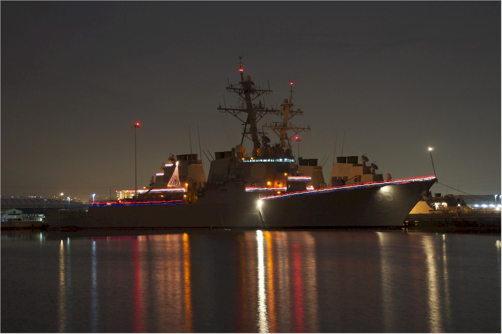 103k | 111209-N-ZC343-966. San Diego, California, December 9 2011, the guided-missile destroyer USS Benfold (DDG 65) displays holiday lights while pier side at Naval Base San Diego. U.S. Navy photo by Senior Chief Mass Communication Specialist Joe Kane, USN. | Robert M. Cieri |