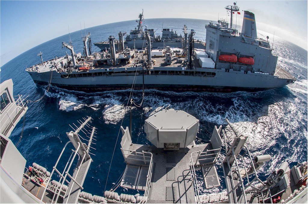 272k | 150905-N-OI810-108. Pacific Ocean, September 5 2015, the Arleigh Burke-class guided missile destroyer USS Benfold (DDG 65) steams alongside the Military Sealift Command fleet replenishment oiler USNS Henry J. Kaiser (T-AO 187) and guided missile destroyer USS Benfold (DDG 65) during a replenishment-at-sea with the Nimitz-class aircraft carrier USS Ronald Reagan (CVN 76). Ronald Reagan, and its embarked carrier air wing, Carrier Air Wing (CVW) 5, provide a combat-ready force that protects the collective maritime interests of its allies and partners in the Indo-Asia-Pacific Region. U.S. Navy photo by Mass Communication Specialist 3rd Class Nathan Burke. | Lee Wahler |