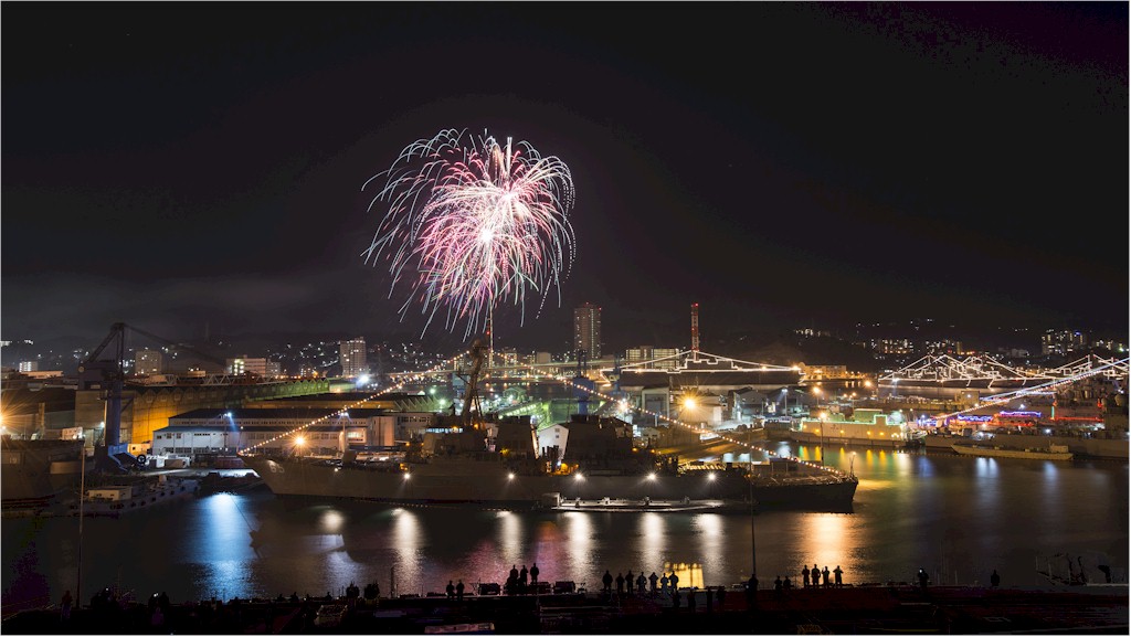 132k | 160101-N-TE278-119. Yokosuka, Japan, January 1 2016, sailors observe fireworks to celebrate the new year from the flight deck of the U.S. Navy's only forward-deployed aircraft carrier USS Ronald Reagan (CVN 76) at Commander Fleet Activities Yokosuka, Japan. Ronald Reagan and its embarked air wing, Carrier Air Wing (CVW) 5, provide a combat-ready force that protects and defends the collective maritime interests of the U.S. and its allies and partners in the Indo-Asia-Pacific region. U.S. Navy photo by Mass Communication Specialist 2nd Class Paolo Bayas. | Ron Reeves |