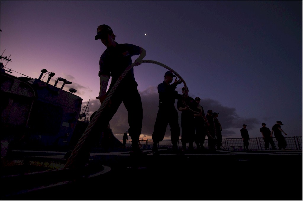 153k | 100707-N-4400J-054. Pearl Harbor, July 7 2010, a mooring line released by Sailors aboard the guided-missile destroyer USS Sampson (DDG 102) splashes into the water before being recovered by Sailors aboard the guided-missile destroyer USS Benfold (DDG 65) as Benfold pulls away to join maritime exercises as part Rim of the Pacific (RIMPAC) 2010 exercises. RIMPAC is a biennial, multinational exercise designed to strengthen regional partnerships and improve multinational interoperability. U.S. Navy photo by Mass Communication Specialist 1st Class Keith E. Jones. | Bill Gonyo |