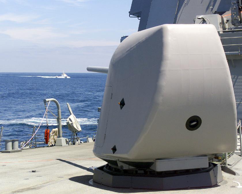 | 65k | Rear view picture of 5"/54 Mark 45 aboard USS Benfold (DDG-65) in July 2002. Note the framing of the Mark 45 and the canvas-covered 0.50" BMG Mount on starboard side. US Navy Photograph No. 020728-N-5067K-004. | Robert Hurst |