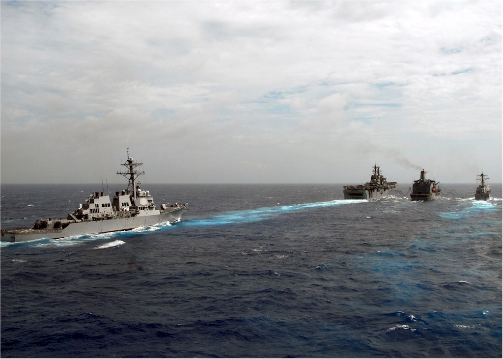 | 147k | 080903-N-9134V-052. Atlantic Ocean, September 3 2008, the guided-missile destroyer USS Ramage (DDG 61) transits the Atlantic while the multi-purpose amphibious assault ship USS Iwo Jima (LHD 7) and the guided-missile destroyer USS Roosevelt (DDG 80) conduct a replenishment at sea (RAS) with the Military Sealift Command fleet replenishment oiler USNS Big Horn (T-AO 198). Ramage, Iwo Jima and Roosevelt are deployed as part of the Iwo Jima Expeditionary Strike Group supporting maritime security operations in the U.S. 5th and 6th Fleet areas of responsibility. U.S. Navy photo by Mass Communication Specialist 2nd Flordeliz Valerio. | Robert M. Cieri |