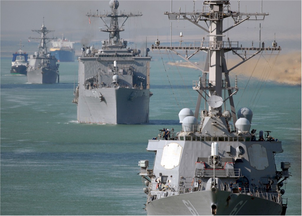| 162k | 080923-N-4236E-269. Suez Canal, Egypt, September 23 2008, the guided-missile destroyer USS Ramage (DDG 61), the amphibious dock landing ship USS Carter Hall (LSD 50) and the guided-missile destroyer USS Roosevelt (DDG 80) transit the Suez Canal. Ramage, Carter Hall and Roosevelt are deployed as part of the Iwo Jima Expeditionary Strike Group supporting maritime security operations in the U.S. 5th Fleet area of responsibility. U.S. Navy photo by Mass Communication Specialist Seaman Chad R. Erdmann. | Robert M. Cieri |