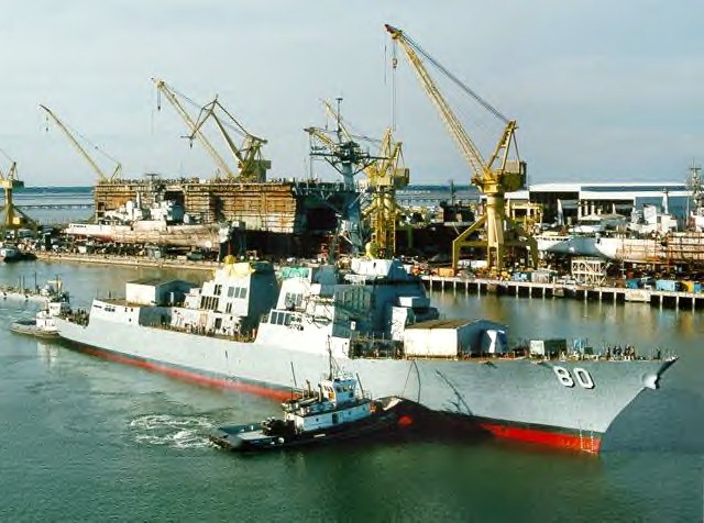 | 90k | DDG 80, the newest of the Aegis guided missile destroyers was launched Jan. 10, 1999, at Pascagoula, Miss. The new ship will be christened Roosevelt Jan. 23 and honors Franklin Delano Roosevelt (1882-1945), the 32nd U.S. President, and First Lady Eleanor Roosevelt (1884-1962). The ship is the thirteenth built by Ingalls Shipbuilding. Photo by Ingalls Shipbuilding Jan. 10, 1999. | Fred Weiss |