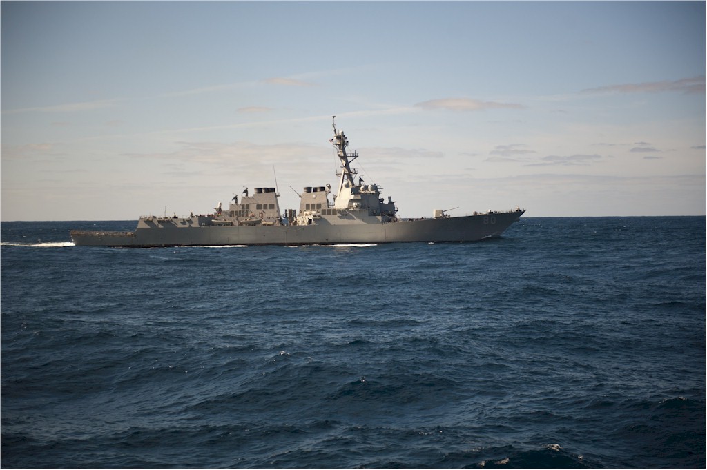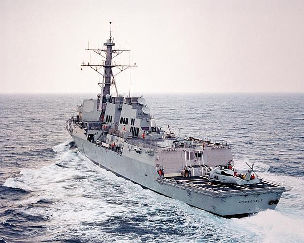 | 130k | 140223-N-WD757-006. Atlantic Ocean, February 23 2014, the Arleigh Burke-class guided-missile destroyer USS Roosevelt (DDG 80) underway. Roosevelt is part of Carrier Strike Group 2 and is deploying in support of maritime security operations, theater security cooperation efforts and missions in support of Operation Enduring Freedom in the U.S. 5th and 6th Fleet areas of responsibility. U.S. Navy photo by Mass Communication Specialist 2nd Class Carlos M. Vazquez II. | Robert M. Cieri |