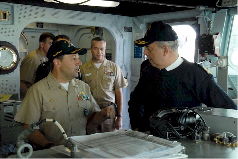 | 112k | 070412-N-3888C-002. Augusta Bay, Sicily, April 12 2007, Cmdr. John A. Carter, commanding officer of guided missile destroyer USS Roosevelt (DDG 80), gives a tour of the ship to Italian navy Vice Adm. Roberto Cesaretti, Commander, Allied Maritime Component Command Naples, during a visit before the beginning of the multinational exercise Noble Manta 2007. Noble Manta is designed to provide individual NATO Response Forces training for participating units, sharpening anti-submarine warfare skills. Roosevelt is the flagship for Standing NATO Maritime Group Two (SNMG2). U.S. Navy photo by Mass Communication Specialist 2nd Class Leonardo Carrillo. | Bill Gonyo |