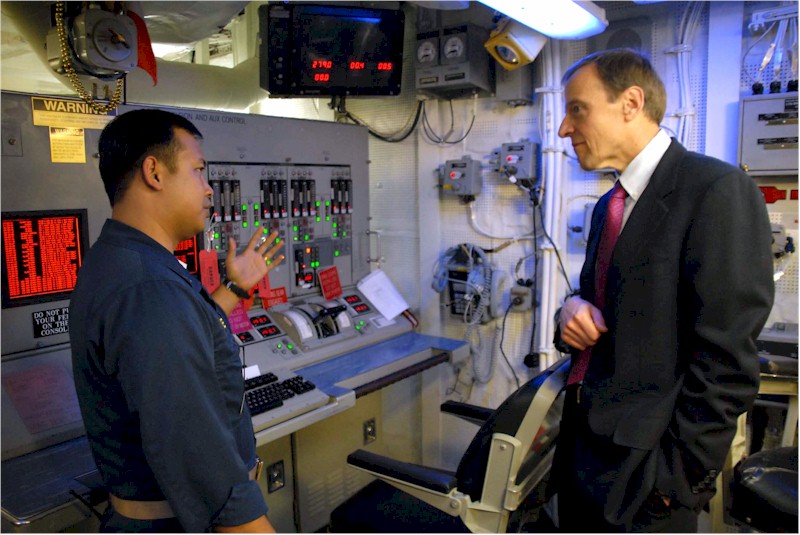 | 120k | 070404-N-3888C-012. Split, Croatia, April 4 2007, U.S. Navy Lt. j.g. James K. Swe, assigned to the guided-missile destroyer USS Roosevelt (DDG 80), the flagship for Standing NATO Maritime Group 2 (SNMG-2), gives a tour of the engineering spaces to the U. S. Ambassador to Croatia the Honorable Robert Bradtke. SNMG-2 was established as an immediate reaction force and as NATO’s maritime ready response force. U.S. Navy photo by Mass Communication Specialist 2nd Class Leonardo Carrillo. | Bill Gonyo |