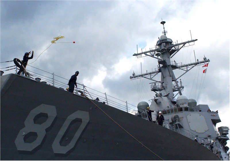 | 94k | 060208-N-0780F-006. Souda Bay, Crete, Greece, February 8 2006, a sailor aboard the guided-missile destroyer USS Roosevelt (DDG 80) throws a heaving line to the pier during mooring operations, as the ship arrive for a routine port visit. U.S. Navy photo by Mr. Paul Farley | Robert M. Cieri |