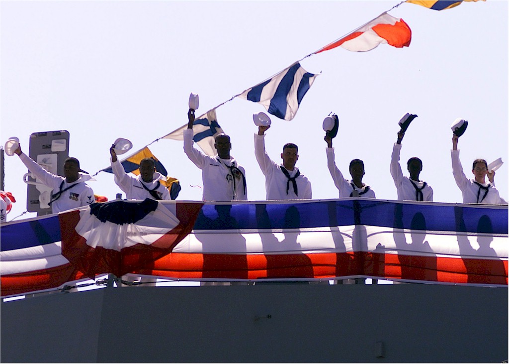 | 142k | 001014-N-0424M-004. Naval Station Mayport, Florida, October 14 2000, crewmembers aboard the guided-missile destroyer USS Roosevelt (DDG 80) raise their covers after "bringing the ship to life" during the commissioning ceremony of the U.S Navy's newest Arleigh Burke class guided missile destroyer at Mayport Naval Station in Jacksonville, FL. U.S. Navy photo by Photographers Mate 2nd Class Jason W. Morris. | Robert M. Cieri |