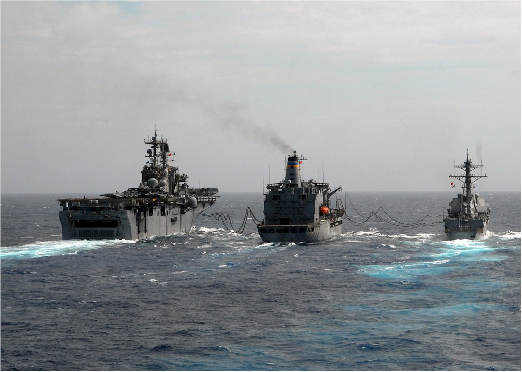 | 158k | 080903-N-9134V-050. Atlantic Ocean, September 3 2008, the multi-purpose amphibious assault ship USS Iwo Jima (LHD 7) and the guided-missile destroyer USS Roosevelt (DDG 80) conduct a replenishment at sea (RAS) with the Military Sealift Command fleet replenishment oiler USNS Big Horn (T-AO 198). Iwo Jima and Roosevelt are deployed as part of the Iwo Jima Expeditionary Strike Group in the U.S. 5th and 6th Fleet areas of responsibility supporting maritime security operations. U.S. Navy photo by Mass Communication Specialist 2nd Class Flordeliz Valerio. | Robert M. Cieri |
