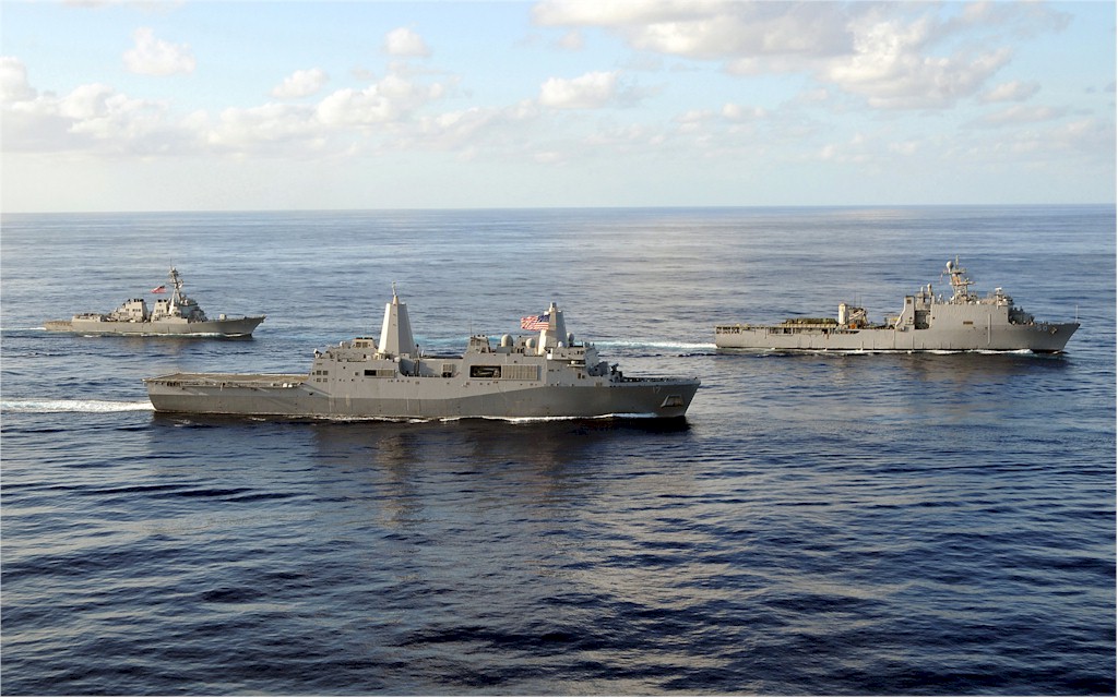 | 176k | 080906-N-1082Z-295. Atlantic Ocean, September 6 2008, the amphibious dock landing ship USS Carter Hall (LSD 50), the amphibious transport dock ship USS San Antonio (LPD 17), and the guided-missile destroyer USS Roosevelt (DDG 80) transit the Atlantic Ocean. Carter Hall, San Antonio and Roosevelt are deployed as part of the Iwo Jima Expeditionary Strike Strike Group, which is supporting maritime security operations in the U.S. Navy's 5th and 6th Fleet areas of responsibility. U.S. Navy photo by Mass Communication Specialist 2nd Class Jason R. Zalasky. | Robert M. Cieri |