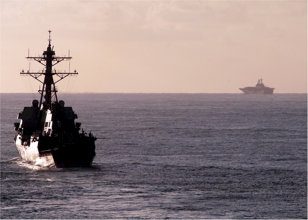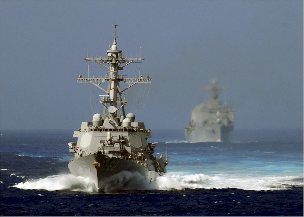 | 135k | 080903-N-4236E-103. Atlantic Ocean, September 3 2008, the guided-missile destroyer USS Roosevelt (DDG 80) maneuvers ahead of the amphibious transport dock ship USS Carter Hall (LSD 50). Roosevelt and Carter Hall are deployed as part of the Iwo Jima Expeditionary Strike Group in the U.S. Navy's 5th and 6th Fleet areas of responsibility supporting maritime security operations. U.S. Navy photo by Mass Communication Specialist Seaman Chad R. Erdmann. | Robert M. Cieri |
