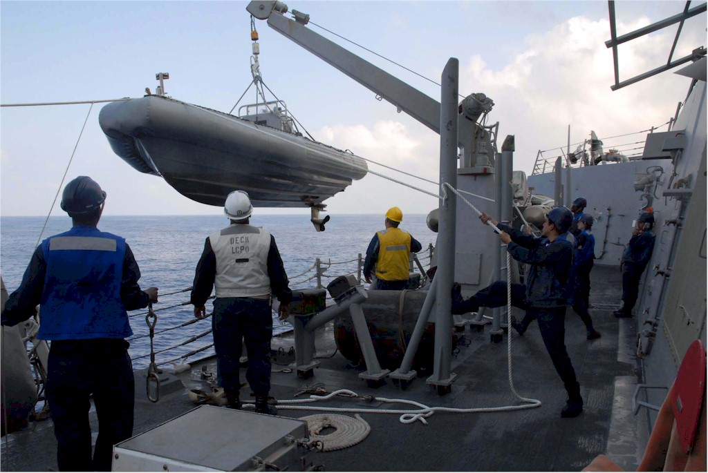 | 151k | 070418-N-3888C-003. Mediterranean Sea, April 18 2007, sailors assigned to guided missile destroyer USS Roosevelt (DDG 80), the flagship for Standing NATO Maritime Group Two (SNMG2), hoist the ship’s rigid hull inflatable boat (RHIB) after a training exercise by the ship’s visit, board, search and seizure (VBSS) team. Roosevelt is participating in the multinational exercise Noble Manta 2007. The exercise is designed to provide individual NATO Response Forces training for participating units, sharpening antisubmarine warfare skills. U.S. Navy photo by Mass Communication Specialist 2nd Class Leonardo Carrillo. | Bill Gonyo |