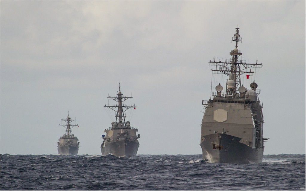 | 105k | 140220-N-EI510-385. Atlantic Ocean, February 19 2014, the Ticonderoga-class guided-missile cruiser USS Philippine Sea (CG 58) leads the Arleigh Burke-class guided-missile destroyers USS Arleigh Burke (DDG 51) and USS Roosevelt (DDG 80) while underway. Philippine Sea, Arleigh Burke and Roosevelt are deployed as part of the George H. W. Bush Carrier Strike Group in support of maritime security operations, theater security cooperation efforts and missions in support of Operation Enduring Freedom in the U.S. 5th and 6th Fleet areas of responsibility. U.S. Navy photo by Mass Communication Specialist 3rd Class Scott Ba. | Robert M. Cieri |