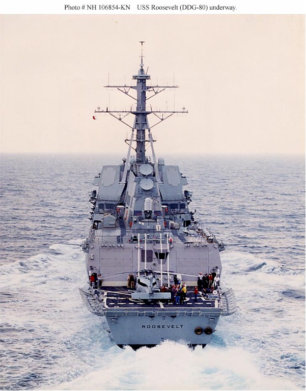 | 116k | USS Roosevelt (DDG-80) underway in the Gulf of Mexico on 1 May 2000, during builder's sea trials. Note the H-60 type helicopter parked on her stern. Official U.S. Navy Photograph, from the collections of the Naval History and Heritage Command. Photo # NH 106854-KN. | Robert Hurst |