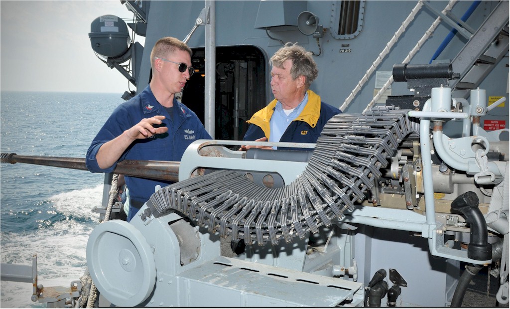| 196k | 110324-N-AW702-002. Atlantic Ocean, March 24 2011, Gunner's Mate 2nd Class Ryan Ruch explains the Mk-38 .25 mm machine gun operation to Harvey Oltman, aboard the guided-missile destroyer USS Roosevelt (DDG 80) while under way. Oltman is participating in the friends and family cruise, where guests learn experience life aboard a U.S. Navy vessel. US Navy photo by Mass Communication Specialist Seaman Jacob Sippel. | Robert M. Cieri |