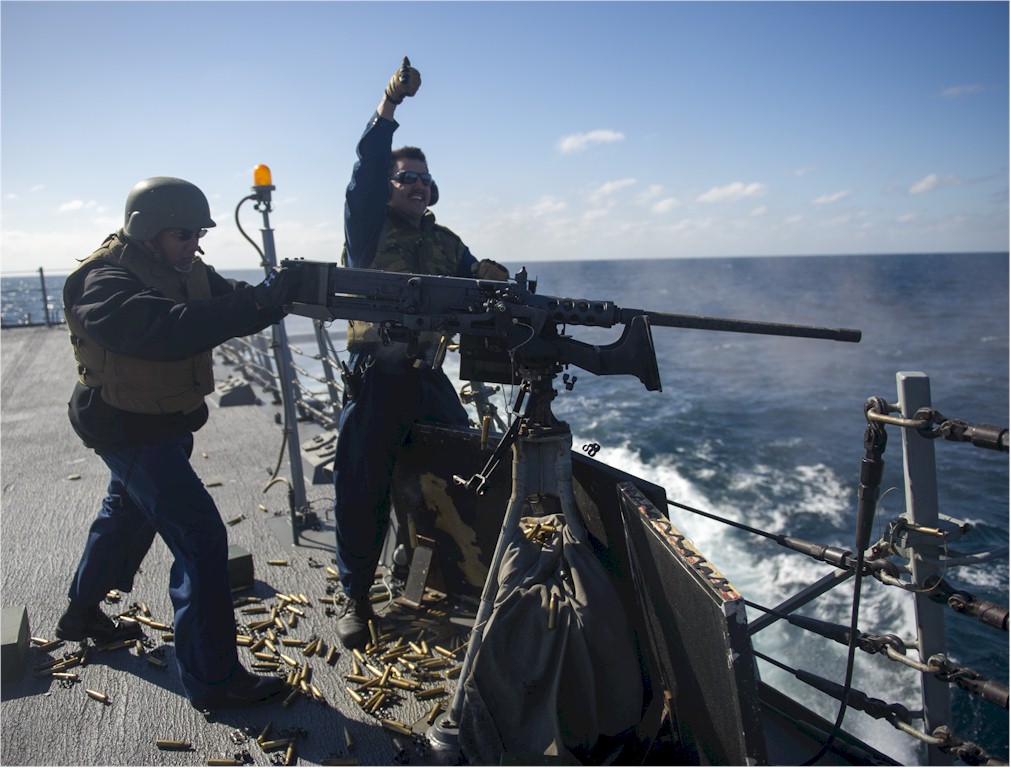 | 170k | 131128-N-VC599-468. Atlantic Ocean, November 28 2013, Culinary Specialist 1st Class Bernardo Tinoco, left, from Dallas, and Gunner's Mate 2nd Class Jeff Strauss, from Jacksonville, Fla., fire a .50-caliber machine gun during a live-fire exercise aboard the guided-missile destroyer USS Roosevelt (DDG 80). Roosevelt is conducting its final pre-deployment evaluation with the George H.W. Bush Carrier Strike Group to achieve mission readiness and the ability to work alongside international allies in the execution of the Navy's maritime strategy. U.S. Navy Photo by Mass Communication Specialist 3rd Class Justin Wolpert. | Robert M. Cieri |