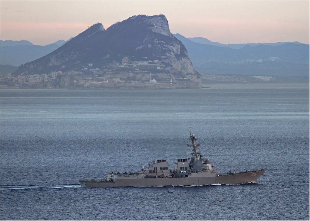 | 193k | 140227-N-AP620-002. Mediterranean Sea, February 27 2014, the guided-missile destroyer USS Roosevelt (DDG 80), attached to the George H.W. Bush Carrier Strike Group, transits the Strait of Gibraltar. Roosevelt is on deployment supporting maritime security operations and theater security cooperation efforts in the U.S. 5th and 6th Fleet areas of responsibility. U.S. Navy photo by Lt. Juan David Guerra. | Robert M. Cieri |