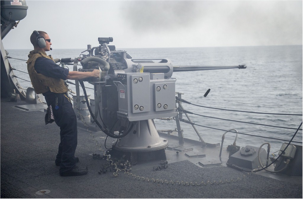 | 137k | 140326-N-VC599-059. Arabian Sea, March 26 2014, Gunner's Mate 2nd Class Gasper Pena, from Rockport, Texas, fires a 25mm machine gun during an exercise aboard the Arleigh Burke-class guided-missile destroyer USS Roosevelt (DDG 80). Roosevelt is deployed as part of the George H. W. Bush Strike Group supporting maritime security operations and theater security cooperation efforts in the U.S. 5th Fleet area of responsibility. U.S. Navy Photo by Mass Communication Specialist 2nd Class Justin Wolpert. | Robert M. Cieri |