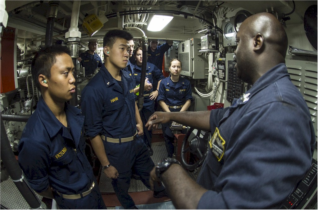| 192k | 140708-N-VC599-049. Arabian Gulf, July 8 2014, Machinist's Mate 1st Class Dan Ankoma, from Roanoke, Va., gives midshipmen a tour of engineering spaces aboard the Arleigh Burke-class guided-missile destroyer USS Roosevelt (DDG 80). Roosevelt is deployed as a part of the George H.W. Bush Carrier Strike Group supporting maritime security operations and theater security cooperation efforts in the U.S. 5th fleet area of responsibility. U.S. Navy Photo by Mass Communication Specialist 2nd Class Justin Wolpert. | Ron Reeves |