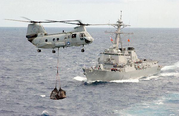 | 56k | A CH-46D "SEa Knight" assigned to the "Gunbearers" of Helicopter Combat Support Squadron One One (HC-11), conducts a vertical replenishment while the Guided Missile Destroyer USS Lassen DDG-82 prepares to come alongside the fast combat support ship USS Sacramento for a underway replenishment. U.S. Navy photo by Photographers Mate 3rd class Ryan Jackson Feb 10, 2003 | Steven A. Cardali |