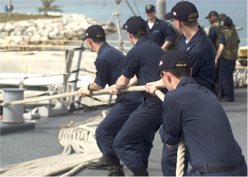 | 102k | 070414-N-5253W-002. Guam, April 14 2007, line handlers aboard the Arleigh Burke-class guided-missile destroyer USS Lassen (DDG 82) heave on the forward mooring line as the ship pulls into Guam to take on fuel and supplies. U.S. Navy photo by Mass Communication Specialist Seaman Gabriel S. Weber. | Bill Gonyo |