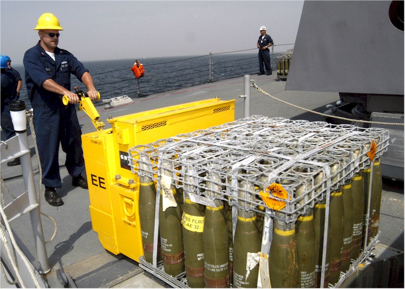 | 145k | 070918-N-4649C-110. Yokosuka, Japan, September 18 2007, Gunner's Mate 1st Class Matt Kelly loads ordnance onto an elevator aboard Arleigh-Burke class guided-missile destroyer USS Lassen (DDG 82) during an ammunition onload. Low sea state and low winds are just two of the key elements in order to safely complete ammo onload at sea. Lassen is underway for a scheduled deployment. U.S. Navy photo by Mass Communication Specialist 2nd Class Chantel M. Clayton. | Bill Gonyo |