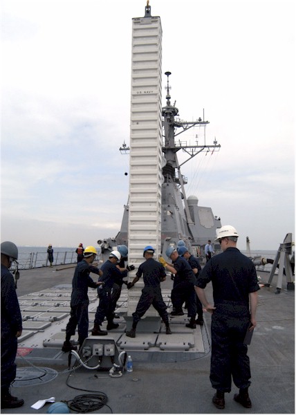 | 55k | 070919-N-4649C-030. Yokosuka, Japan, September 19 2007, sailors aboard guided-missile destroyer USS Lassen (DDG 82) help guide a Tomahawk cruise missile into place during ammunition onload. Low winds and a calm sea state are two necessary elements for a safe onloading evolution. Lassen is forward deployed to Yokosuka, Japan, and is underway on deployment. U.S. Navy photo by Mass Communication Specialist 2nd Class Chantel M. Clayton. | Bill Gonyo |