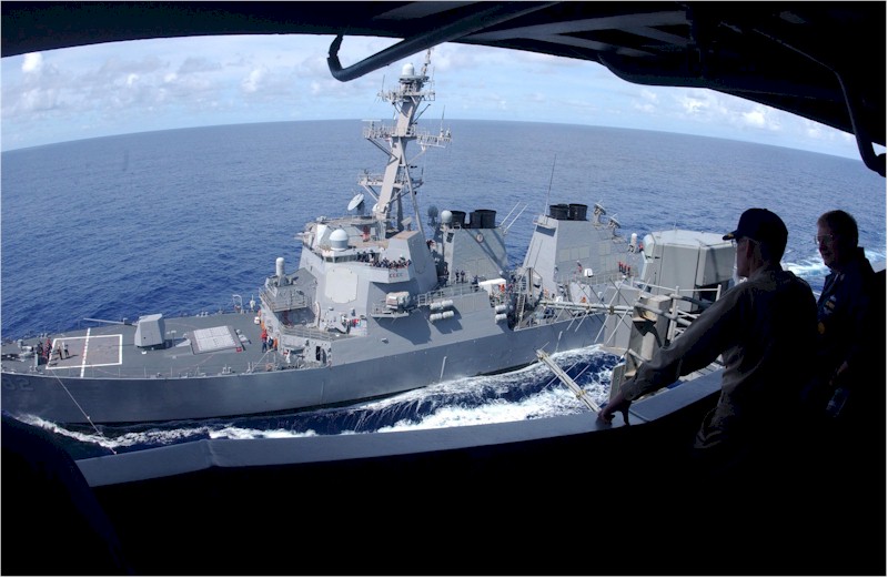 | 95k | Philippine Sea, the guided missile destroyer USS Lassen (DDG 82) steams alongside USS Carl Vinson (CVN 70) during an underway replenishment recently. Lassen, home ported in San Diego, was commissioned April 21, 2001, and is on her maiden voyage as part of the Carl Vinson Battle Group. The battle group is currently on an extended deployment in the Western Pacific. U.S. Navy Photo by Photographer's Mate Airman Chris Valdez. | Bill Gonyo |