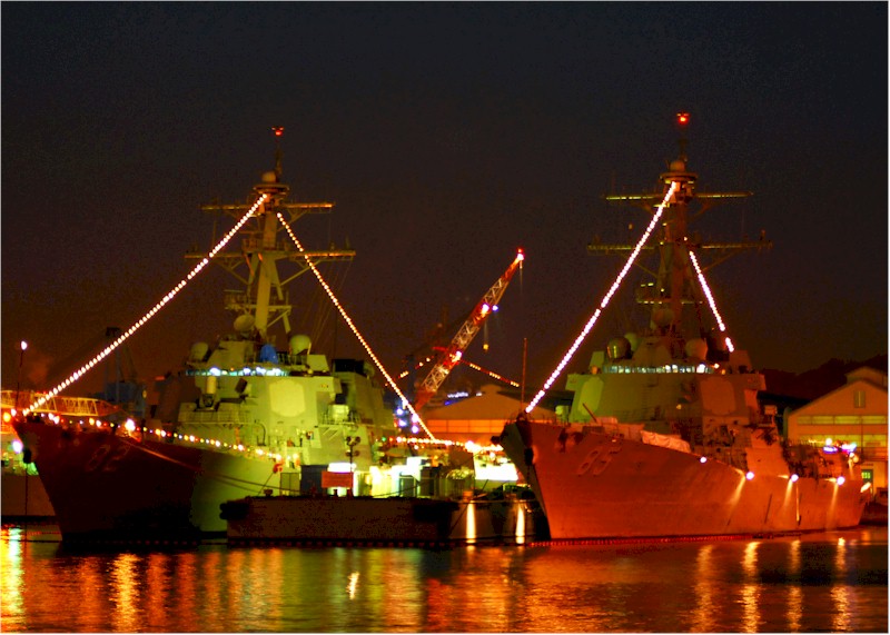 | 113k | Yokosuka, Japan, December 18 2007, holiday lights illuminate the Arleigh Burke-class guided-missile destroyers USS Lassen (DDG 82) and USS McCampbell (DDG 85) at Fleet Activities Yokosuka. Every Yokosuka-based ship of the forward-deployed naval forces is decorated with holiday lights to celebrate the festive season. Just before midnight on New Year's Eve, every ship will go black for a countdown to the New Year. At midnight, every ship will illuminate its holiday lights to bring in the New Year. U.S. Navy photo by Mass Communication Specialist Bryan Reckard, ID# 071218-N-2638R-001. | Robert M. Cieri |