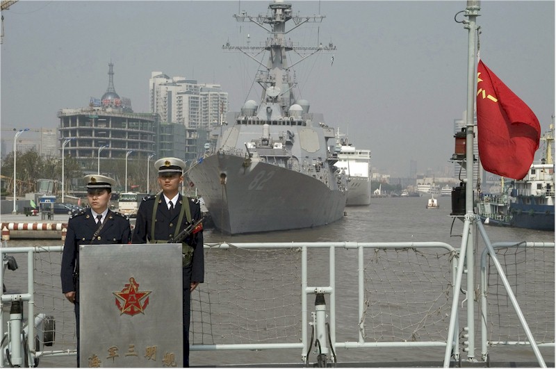 | 111k | 080410-N-1251W-005. Shanghai, People's Republic of China, April 10 2008, the guided-missile destroyer USS Lassen (DDG 82) is moored as two People's Liberation Army Navy (PLAN) Sailors stand watch on the flight deck of the PLAN frigate Sanming (FFGHM 524). U.S. Navy photo by Mass Communication Specialist 3rd Class Matthew R. White. | Robert M. Cieri |