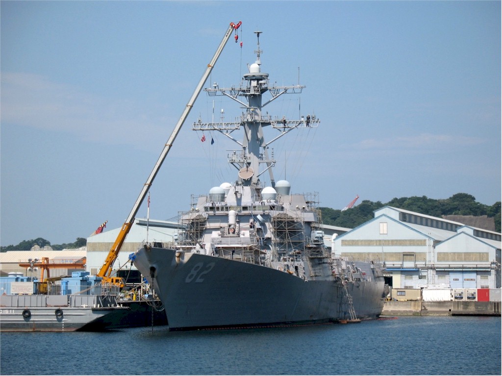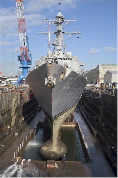 | 118k | Yokosuka, Japan, April 15 2009, the Arleigh-Burke class guided missile destroyer USS Lassen (DDG 82) is in dry dock during dry dock ship's restricted availability at Fleet Activities Yokosuka. Lassen is assigned to Destroyer Squadron 15 and is permanently forward deployed to Yokosuka, Japan. U.S. Navy photo by Mass Communication Specialist Seaman Charles Oki. | Bill Gonyo |