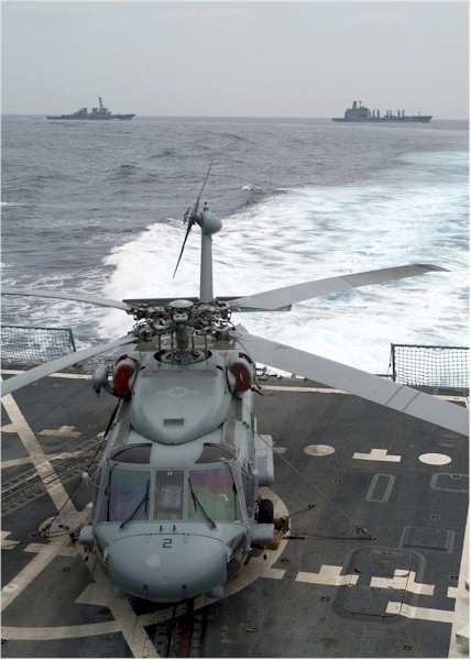 | 69k | 080420-N-1251W-006. Pacific Ocean, April 20 2008, an SH-60 Seahawk assigned to Helicopter Squadron (HS) 14 "Chargers" is secured to the flight deck of the guided-missile destroyer USS Lassen (DDG 82) as she pulls away from the Military Sealift Command fleet replenishment oiler USNS Tippecanoe (T-AO 199), right, after completing an underway replenishment. The guided-missile destroyer USS Curtis Wilbur (DDG 54) is approaching Tippecanoe for a replenishment. Lassen and Curtis Wilbur are conducting routine operations with the Kitty Hawk Strike Group in the Pacific Ocean and are two of seven Arleigh Burke guided missile destroyers assigned to Destroyer Squadron 15. U.S. Navy photo by Mass Communication Specialist 3rd Class Matthew R. White. | Robert M. Cieri |