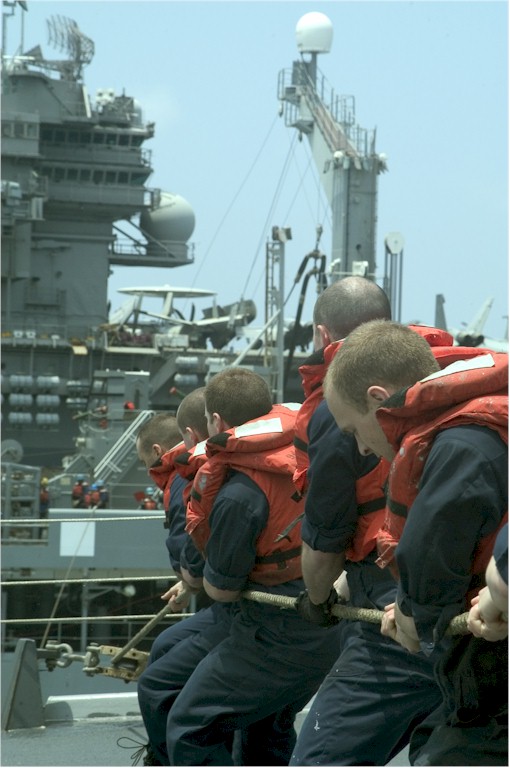 | 89k | 080424-N-1251W-008. April 24 2008, sailors heave a line connecting their ship, the guided-missile destroyer USS Lassen (DDG 82), and the Military Sealift Command Henry J. Kaiser-Class Oiler USNS Tippecanoe (T-AO 199) during a replenishment-at-sea (RAS) operation in the Pacific. U.S. Navy photo by Mass Communication Specialist 3rd Class Matthew R. White. | Robert M. Cieri |