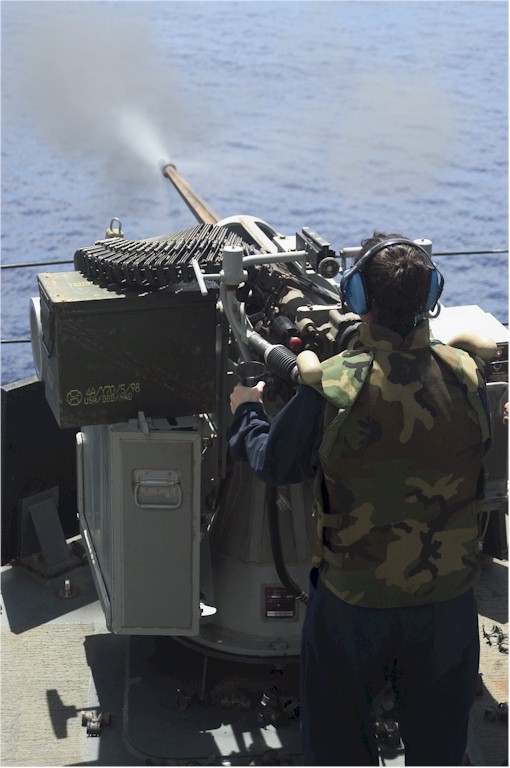 | 81k | 070416-N-5253W-007. Pacific Ocean, April 16 2007, a Gunners Mate aboard the Arleigh Burke-class guided-missile destroyer USS Lassen (DDG 82) mans the starboard 25-mm chain gun during a heavy-weapons qualification shoot. U.S. Navy photo by Mass Communication Specialist Seaman Gabriel S. Weber. | Robert M. Cieri |