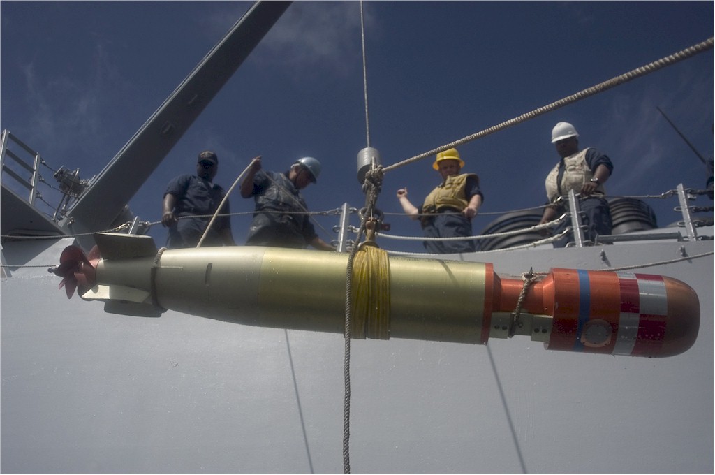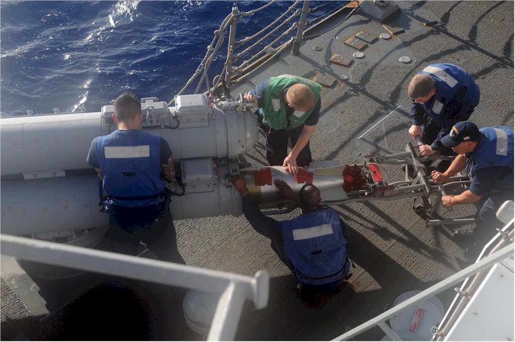 | 196k | 111029-N-IO627-058. Pacific Ocean, October 29 2011, sailors load a MK-46 torpedo aboard the Arleigh Burke Class guided-missile destroyer USS Lassen (DDG-82). Lassen is one of seven destroyers forward deployed to Yokosuka, Japan,as part of Destroyer Squadron (DESRON) 15. U.S. Navy photo by Mass Communication Specialist 3rd Class Andrew Ryan Smith. | Bill Gonyo |