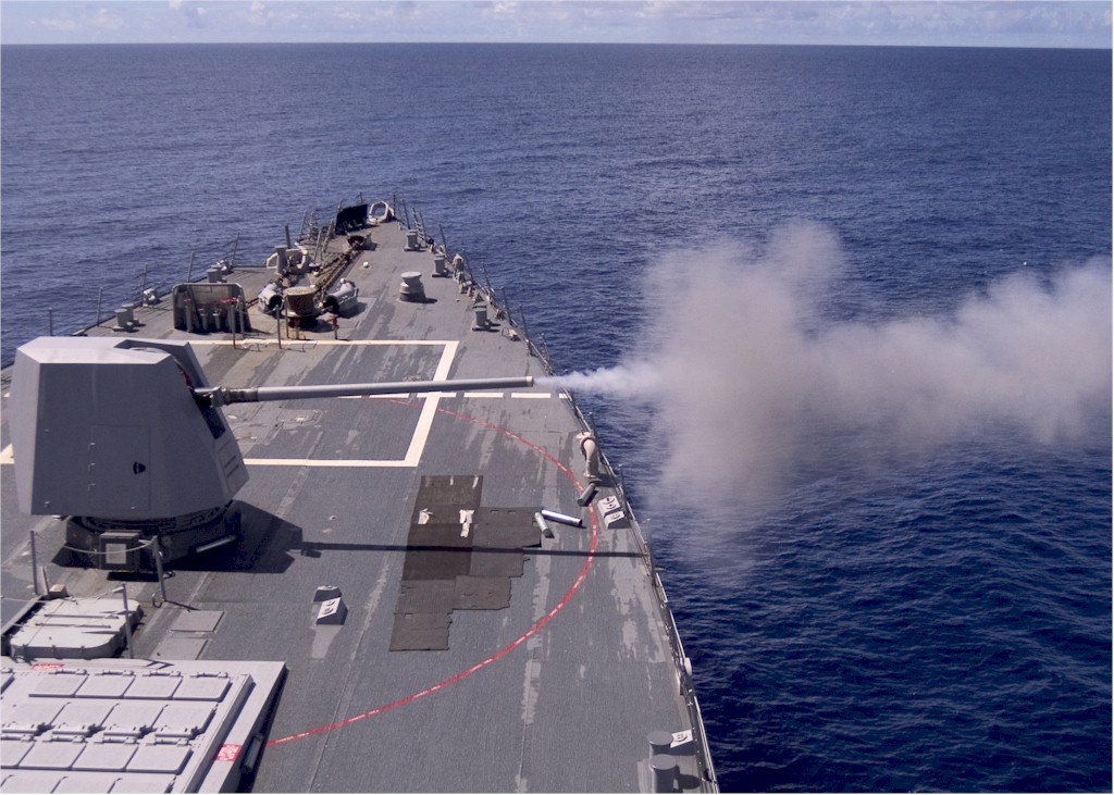 | 196k | 070416-N-5253W-002. Pacific Ocean, April 16 2007, smoke billows from the 5"/62-caliber deck gun aboard the Arleigh Burke-class guided-missile destroyer USS Lassen (DDG 82) during a calibration test firing. U.S. Navy photo by Mass Communication Specialist Seaman Gabriel S. Weber. | Robert M. Cieri |