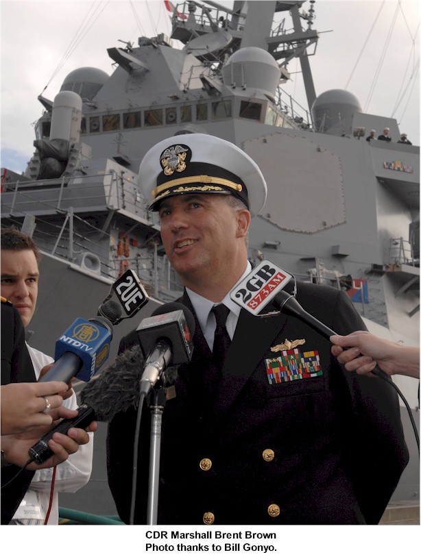 | 165k | 070924-N-4649C-076. Vladivostok, Russia, September 24 2007, Cmdr. Marshall B. Brown, commanding officer of guided-missile destroyer USS Lassen (DDG 82), fields questions from the media. While visiting Vladivostok, the Arleigh Burke-class ship will participate in Pacific Eagle, a bilateral exercise with the Russian Federated Navy. U.S. Navy photo by Mass Communication Specialist 2nd Class Chantel M. Clayton. | Robert M. Cieri |