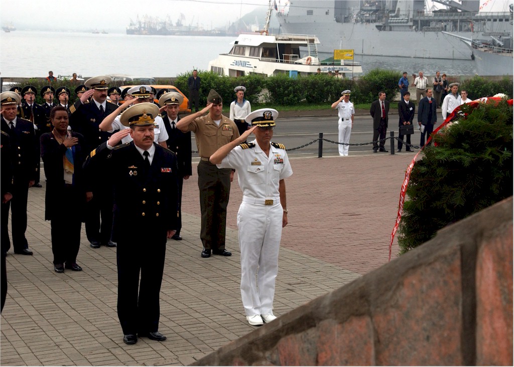 | 198k | 030704-N-7265L-023. Vladivostok, Russia, July 4 2003, U.S. Consul Gen. Vladivostok and Cdr. Hugh Wetherald, Commanding Officer of the U.S. Navy guided missile destroyer USS Lassen (DDG 82), salute during a wreath-laying ceremony at the Slava Tof memorial held in honor of those who died in World War II. Lassen is making a goodwill visit to the country that was last visited by a U.S. ship almost a year ago. U.S. Navy photo by Photographer's Mate 2nd Class Inez Lawson. | Bill Gonyo |