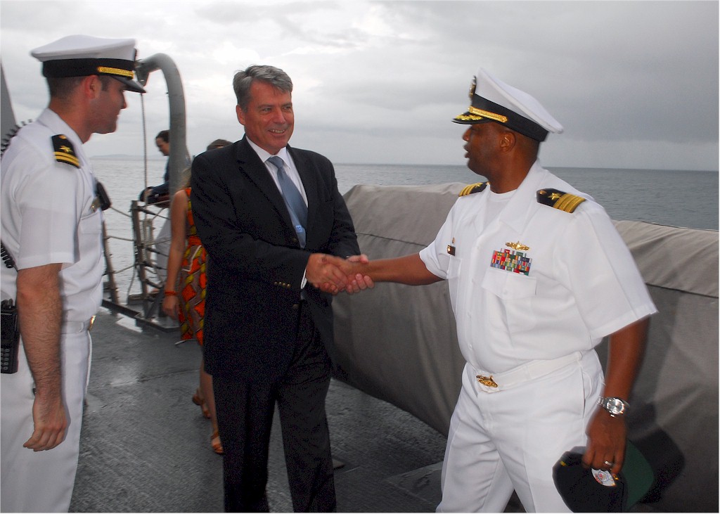 | 150k | 090131-N-2013O-043. Bali, Indonesia, January 31 2009, Cmdr. Anthony Simmons, commanding officer of the Arleigh Burke-class guided-missile destroyer USS Lassen (DDG 82) greets Cameron R. Hume, U.S. Ambassador to Indonesia after Lassen arrives in Bali. Lassen, assigned to Destroyer Squadron 15, is in Bali for a scheduled port visit. (U.S. Navy photo by Mass Communication Specialist Seaman Charles Oki. | Bill Gonyo |