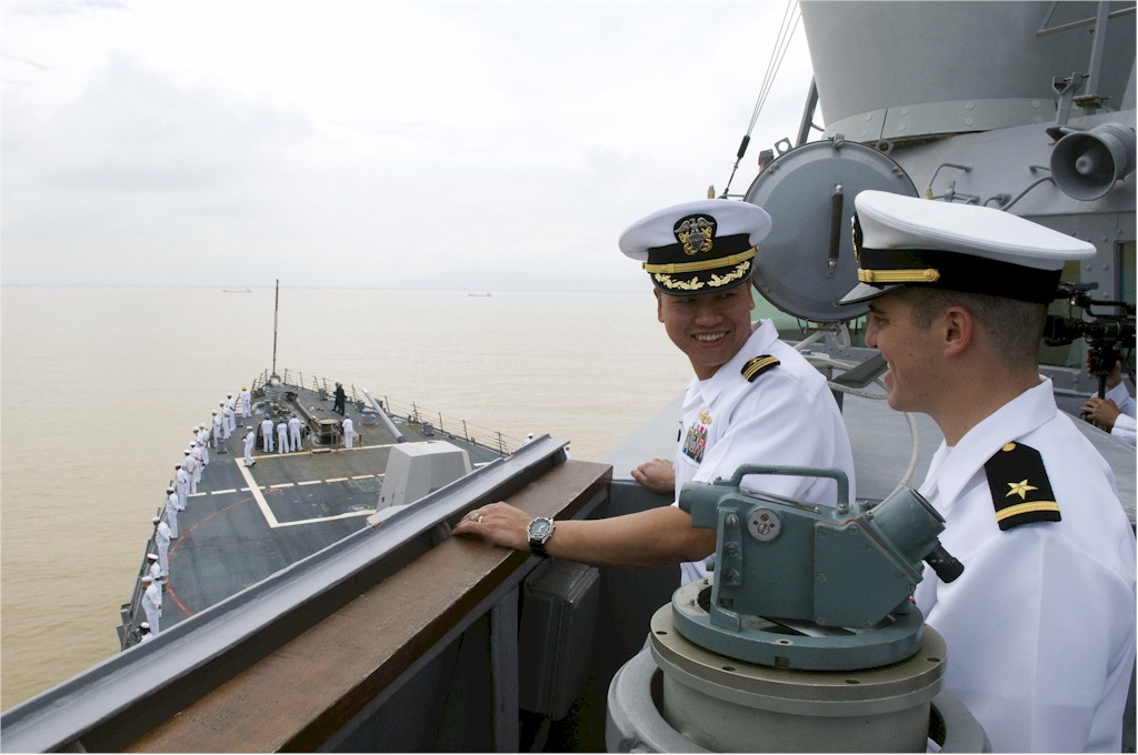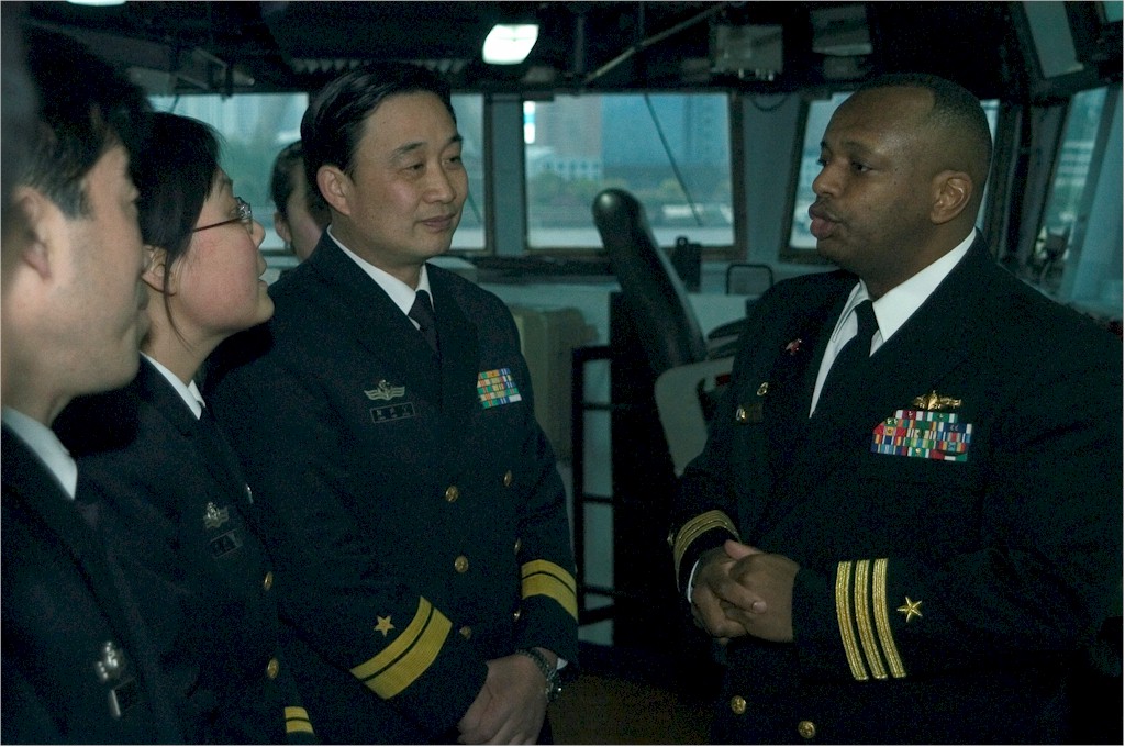 | 193k | 080409-N-1251W-005. Shanghai, People's Republic of China, April 9 2008, Cmdr. Anthony L. Simmons, commanding officer of the guided-missile destroyer USS Lassen (DDG 82), explains the layout of the ship's bridge to officers of the People's Liberation Army Navy (PLAN) during a port visit to Shanghai. Sailors assigned to Lassen were able to experience the local culture and interact with PLAN counterparts. U.S. Navy photo by Mass Communication Specialist 3rd Class Matthew R. White. | Bill Gonyo |