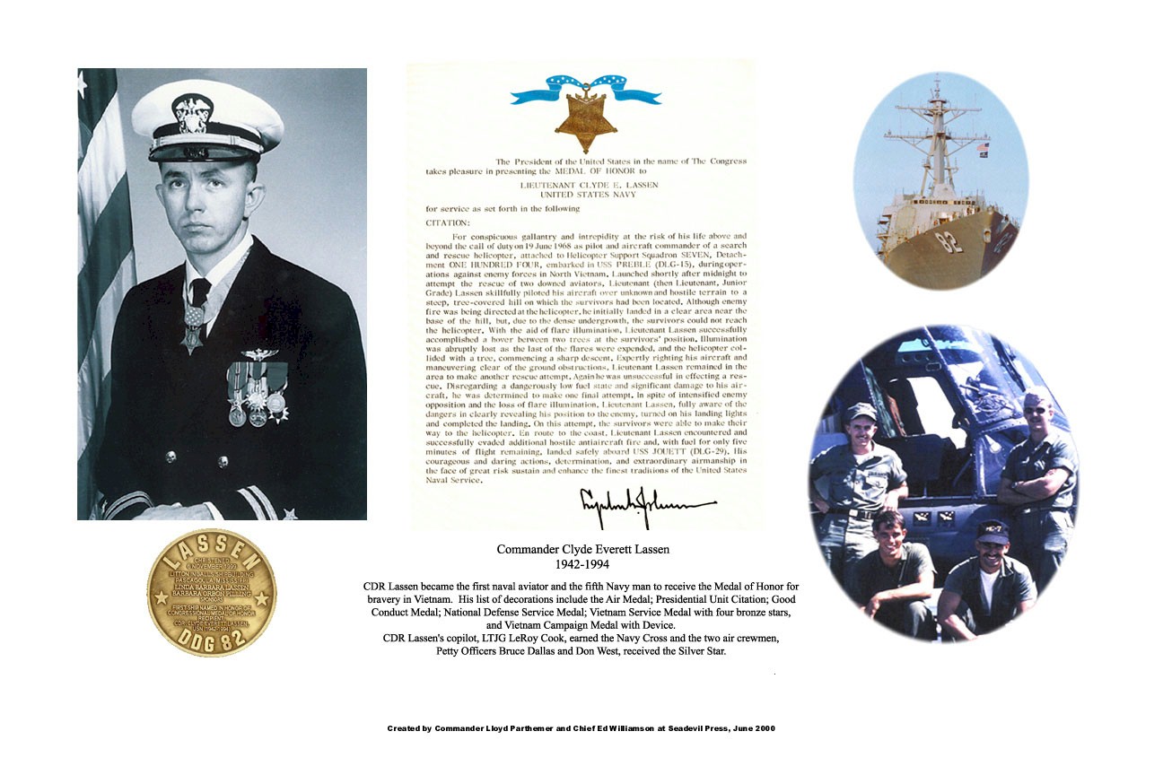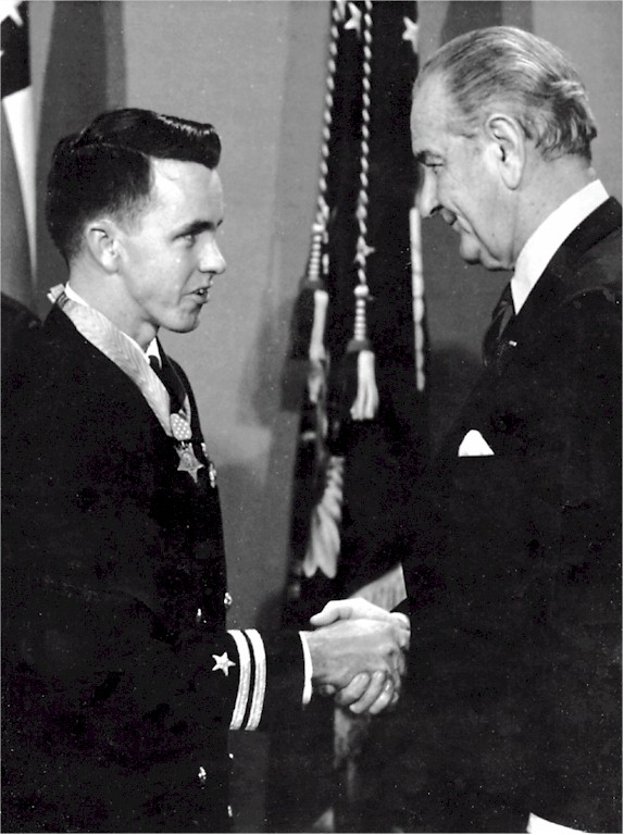 106k | Clyde Everett Lassen, a native of Fort Myers, Florida, earned the Medal of Honor for his courageous rescue of two downed aviators while commander of a search and rescue helicopter in Vietnam. On June 19, 1968, Lassen, then a 27 year old Lieutenant flying a UH-2 Sea sprite, embarked on a mission to recover two downed naval aviators whose plane had been shot down deep in North Vietnamese territory. Upon reaching the hilly terrain where the aviators were hiding, LT Lassen made several attempts to recover the aviators, but dense tree cover, enemy weapons fire and intermittent illumination frustrated his efforts. Determined to complete his mission, LT Lassen turned on the landing lights of the helicopter, despite the danger of revealing his position to the enemy. After the pilots made their way to the helicopter and with his damaged helicopter dangerously low on fuel, LT Lassen evaded further antiaircraft fire before landing safely at sea onboard a guided missile destroyer-with only five minutes of fuel left in the helicopter's fuel lines.The account of the rescue was logged as a successful, routine search and rescue mission. But at the home base for Helicopter Combat Squadron Seven, the rescue flight of June 19, 1968, will always be acclaimed as one of the most daring feats of flying to come out of the Vietnam Conflict. LT Lassen became the first naval aviator and fifth Navy man to be awarded the Medal of Honor for bravery in Vietnam. The second photo shows President Lyndon Johnson as he shakes Clyde Lassen’s hand after awarding him the Medal of Honor at the White House on Jan. 16, 1969. The Englewood, Fla. native was the first Navy aviator to receive the nation’s highest military decoration for valor during the Vietnam War. | Bill Gonyo |