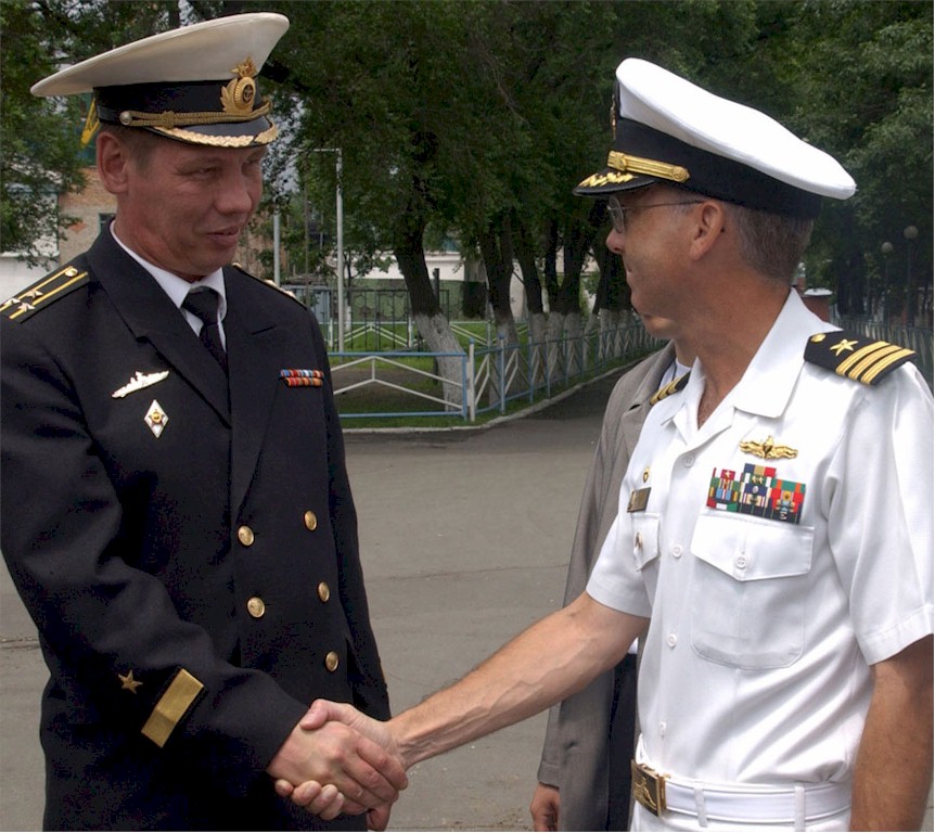 | 165k | The Russian Navy Commanding Officer of Division of Surface Ships, Capt. 1st Rank Valeriy Vasilievich Tereokhin, greets the USS Lassen (DDG 82) Commanding Officer, Cmdr. Hugh Wetherald, before a farewell ceremony, as USS Lassen and USS Fort McHenry (LSD 43) prepare to depart port Vladivostok. The U.S. Navy ships were on a goodwill visit to Russia in July 2003. Photo by PH2 Inez Lawson, USN. | Bill Gonyo |