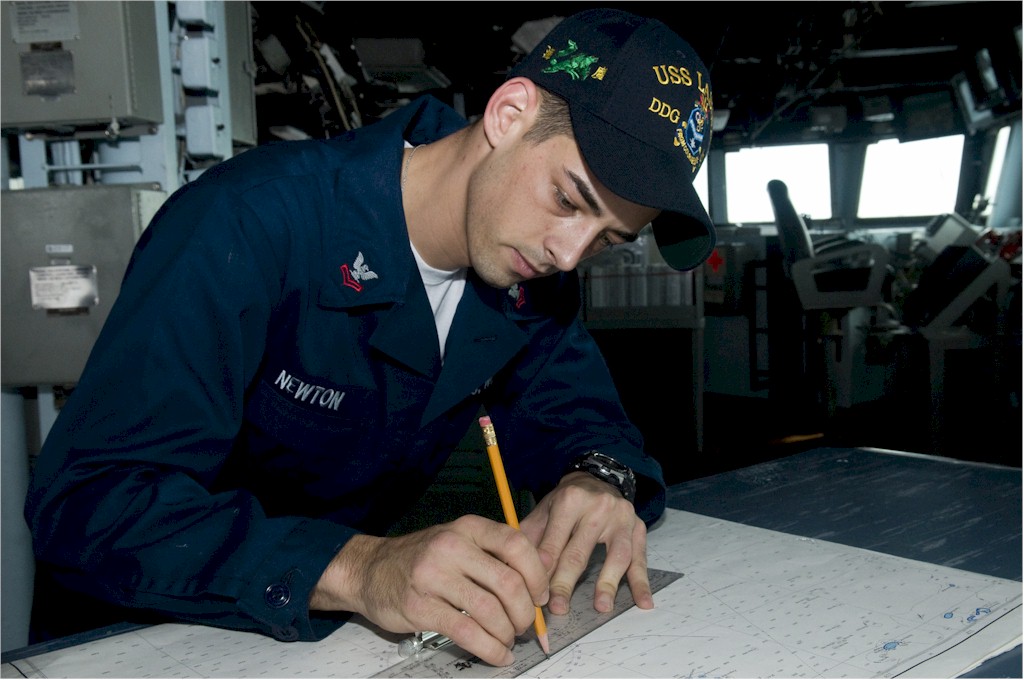 | 141k | 091105-N-1251W-015. Pacific Ocean, November 5 2009, Quartermaster 2nd Class Cody Newton, from Jasper, Ga., plots distances on a chart aboard the guided-missile destroyer USS Lassen (DDG 82) while underway in the Pacific Ocean. U.S. Navy photo by Mass Communication Specialist 2nd Class Matthew R. White. | Robert M. Cieri |