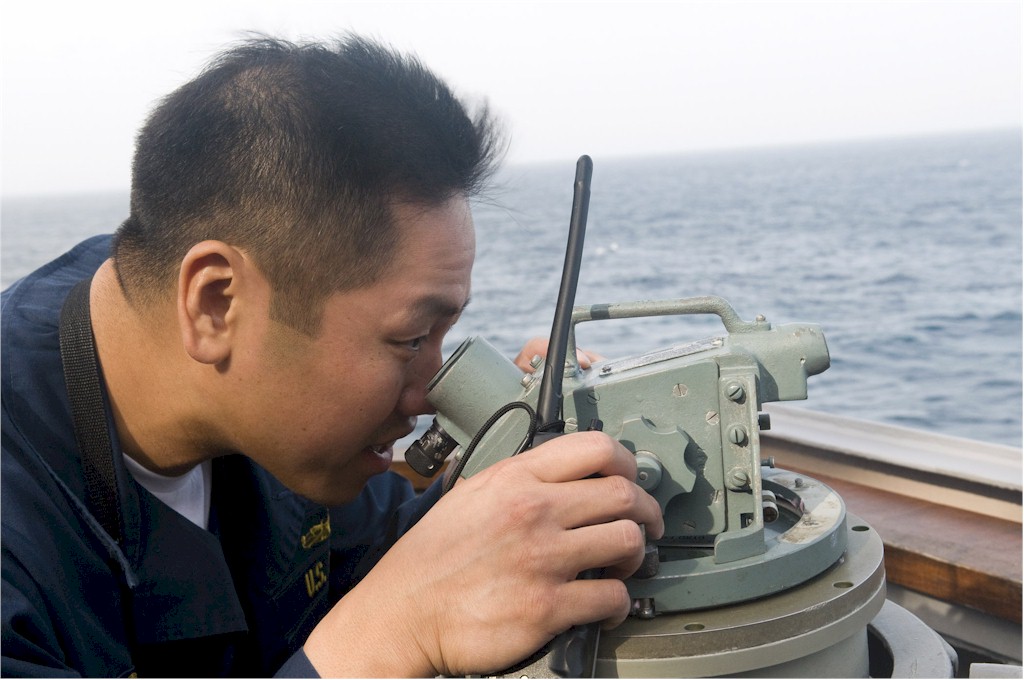 | 134k | 091106-N-1251W-013. Pacific Ocean, November 6 2009, Cmdr. H. B. Le, commanding officer of the guided-missile destroyer USS Lassen (DDG 82), finds the bearing of the Military Sealift Command dry cargo ammunition ship USNS Carl Brashear (T-AKE 7) during an underway replenishment. U.S. Navy photo by Mass Communication Specialist 2nd Class Matthew R. White. | Robert M. Cieri |