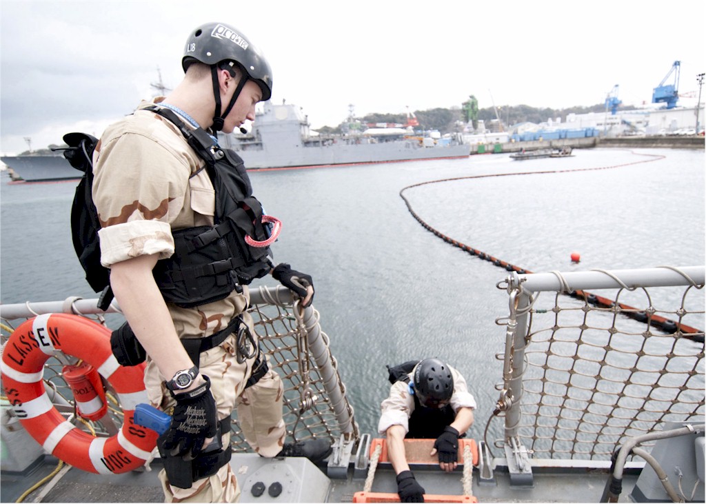 | 181k | 100128-N-8721D-001. Yokosuka, Japan, January 28 2010, Air-Traffic Controller 3rd Class Vince Newell, left, from Detroit, prepares to disembark the guided-missile destroyer USS Lassen (DDG 82). Newell is a member of the visit, board, search and seizure (VBSS) team aboard the Lassen. The VBSS team trains on various weapons and boarding procedures to enhance their proficiency skills when boarding and searching vessels. The Ticonderoga-class guided-missile cruiser USS Lake Erie (CG 70) is moored in the background. U.S. Navy photo by Mass Communication Specialist 3rd Class Devon Dow. | Robert M. Cieri |