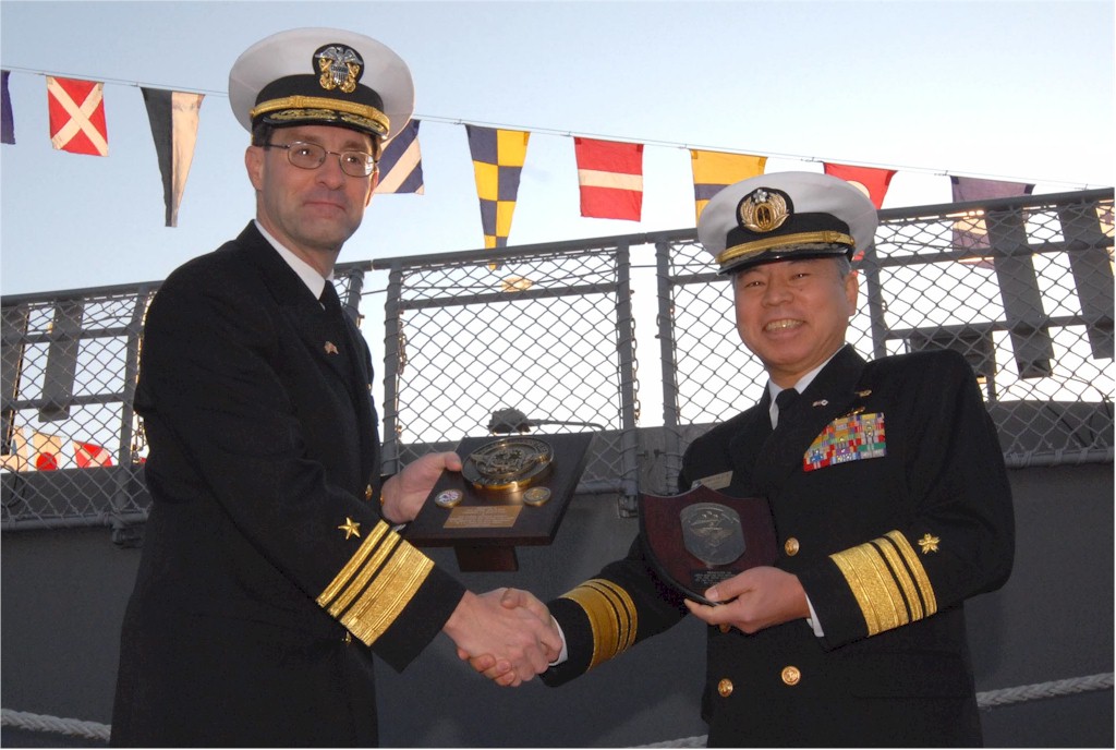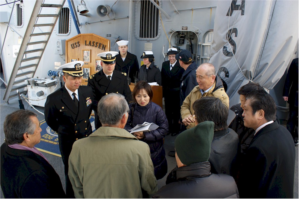 | 180k | 100113-N-2562W-4367. U.S. Navy Cmdr. H.B. Le, commanding officer of the guided-missile destroyer USS Lassen (DDG 82), welcomes board members of the Japan-America Society of Yokosuka for a tour of the ship Jan. 13, 2010, in Yokosuka, Japan. Lassen will participate in a ceremony Jan. 19, 2010, marking the 50th anniversary of the signing of the U.S.-Japan security treaty. U.S. Navy photo by Information Systems Technician 1st Class Benjamin Wooldridge. | Robert M. Cieri |